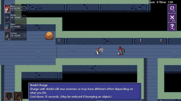 Dark Dragonkin is a weird little game, top down, JRPG-like game that’s more about solving room puzzles endlessly than any actual RPG features. You go room by room, level by level, using 4 different characters with 4 different abilities. You have the Tank character (who is assumably female, love that) who can kick boulders out of the way and smash things, and the ability to use her shield to block attacks. Not only that, but you have the ninja guy who is great for backstabbing people and can jump over large gaps. Next is the druid-type who has the ability to turn into a fairy and fly through cracks in the walls, also having the ability to heal your team. And lastly, you have the mage who shoots fireballs which can light torches and kill enemies as well.